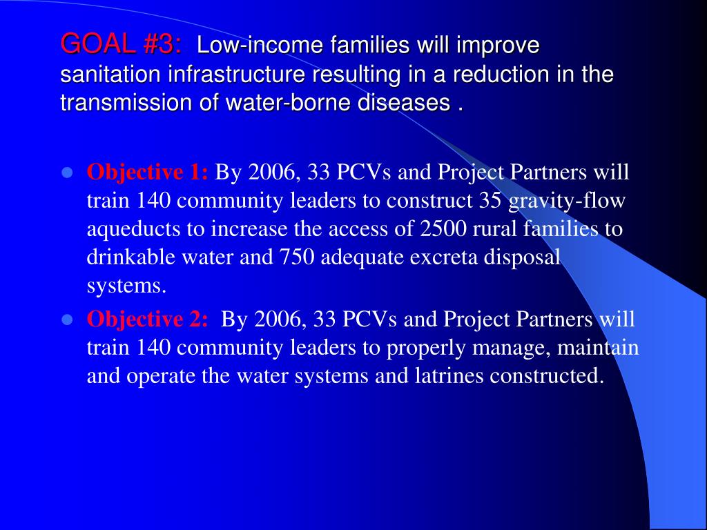 GOAL #3: Low-income families will improve sanitation infrastructure resulting in a reduction in the transmission of water‑borne diseases . • Objective 1:By 2006, 33 PCVs and Project Partners will train 140 community leaders to construct 35 gravity‑flow aqueducts to increase the access of 2500 rural families to drinkable water and 750 adequate excreta disposal systems. • Objective 2:By 2006, 33 PCVs and Project Partners will train 140 community leaders to properly manage, maintain and operate the water systems and latrines constructed.
