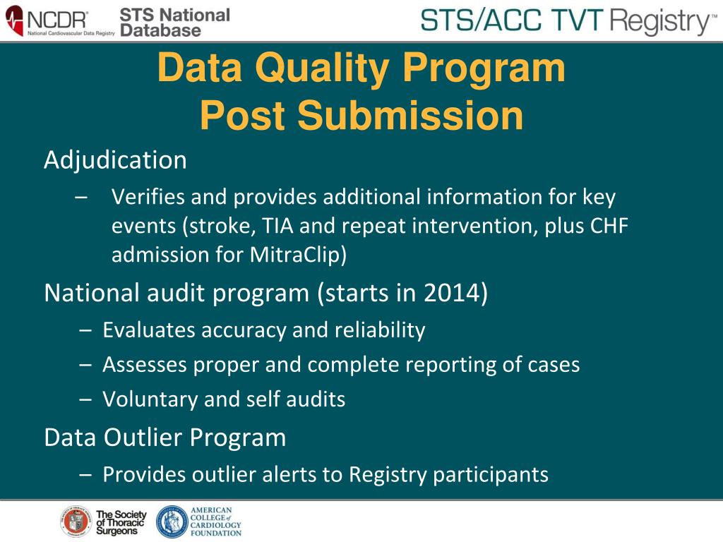 Data Quality ProgramPost Submission Adjudication • Verifies and provides additional information for key events (stroke, TIA and repeat intervention, plus CHF admission for MitraClip) National audit program (starts in 2014) • Evaluates accuracy and reliability • Assesses proper and complete reporting of cases • Voluntary and self audits Data Outlier Program • Provides outlier alerts to Registry participants