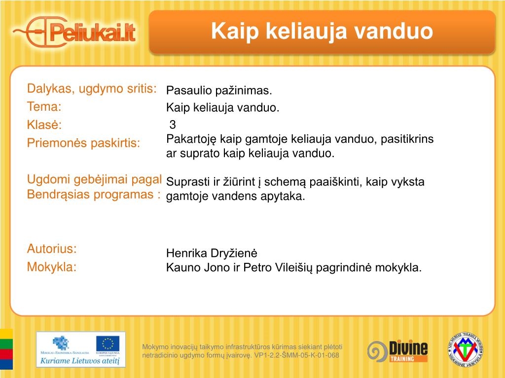 Kaip keliauja vanduo. Dalykas, ugdymo sritis: Tema: Klasė: Priemonės paskirtis: Ugdomi gebėjimai pagal Bendrąsias programas : Autorius: Mokykla:. Pasaulio pažinimas. Kaip keliauja vanduo. 3 Pakartoj ę kaip gamtoje keliauja vanduo, pasitikrins ar suprato kaip keliauja vanduo .