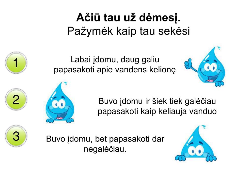 Ačiū tau už dėmesį. Pažymėk kaip tau sekėsi Labai įdomu, daug galiu papasakoti apie vandens kelionę Buvo įdomu ir šiek tiek galėčiau papasakoti kaip keliauja vanduo Buvo įdomu, bet papasakoti dar negalėčiau.