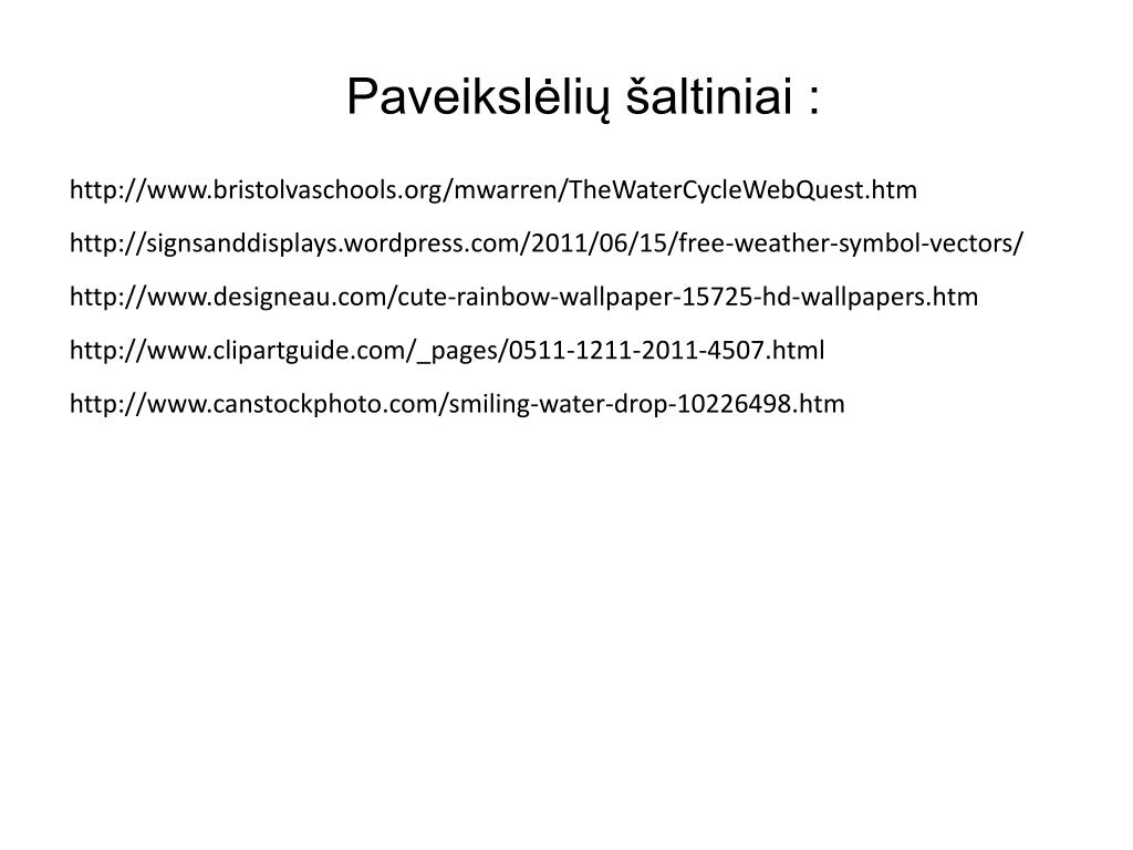 http://www.bristolvaschools.org/mwarren/TheWaterCycleWebQuest.htmhttp://www.bristolvaschools.org/mwarren/TheWaterCycleWebQuest.htm Paveikslėlių šaltiniai : http://signsanddisplays.wordpress.com/2011/06/15/free-weather-symbol-vectors/ http://www.designeau.com/cute-rainbow-wallpaper-15725-hd-wallpapers.htm http://www.clipartguide.com/_pages/0511-1211-2011-4507.html http://www.canstockphoto.com/smiling-water-drop-10226498.htm
