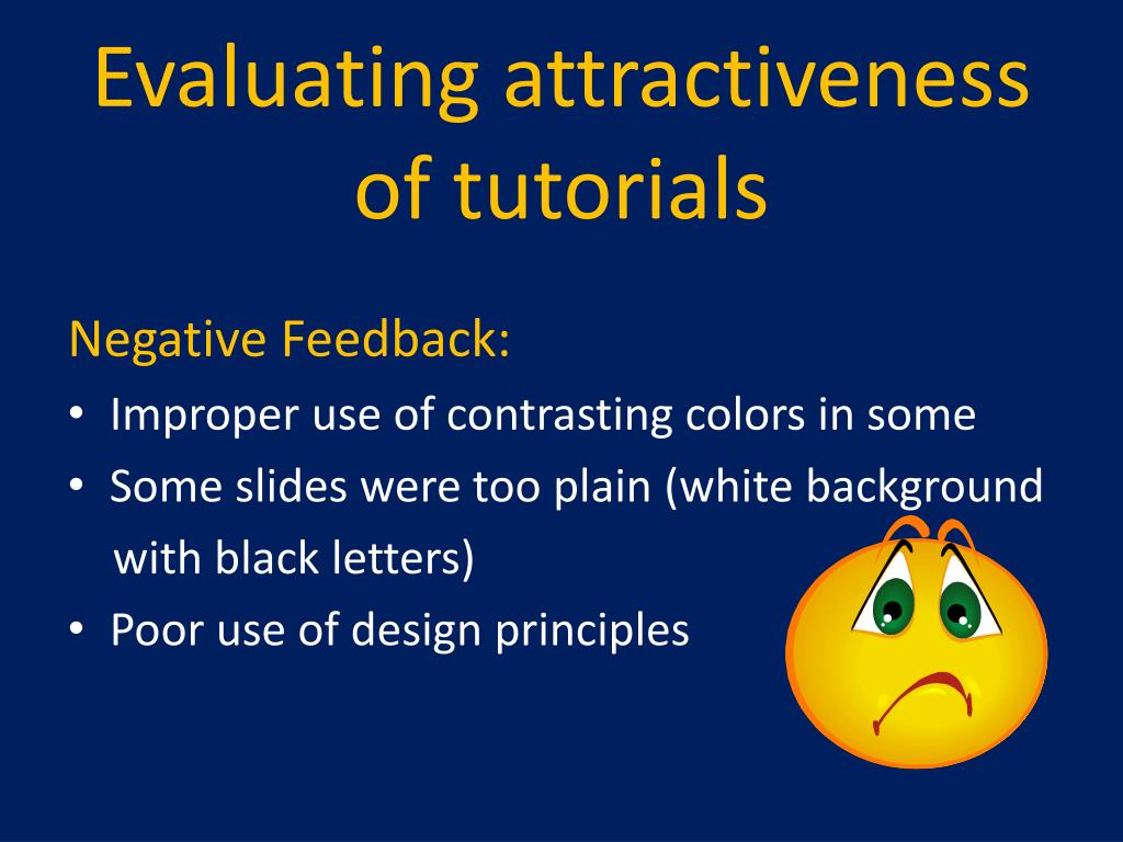 Evaluating attractiveness of tutorials Negative Feedback: • Improper use of contrasting colors in some • Some slides were too plain (white background with black letters) • Poor use of design principles