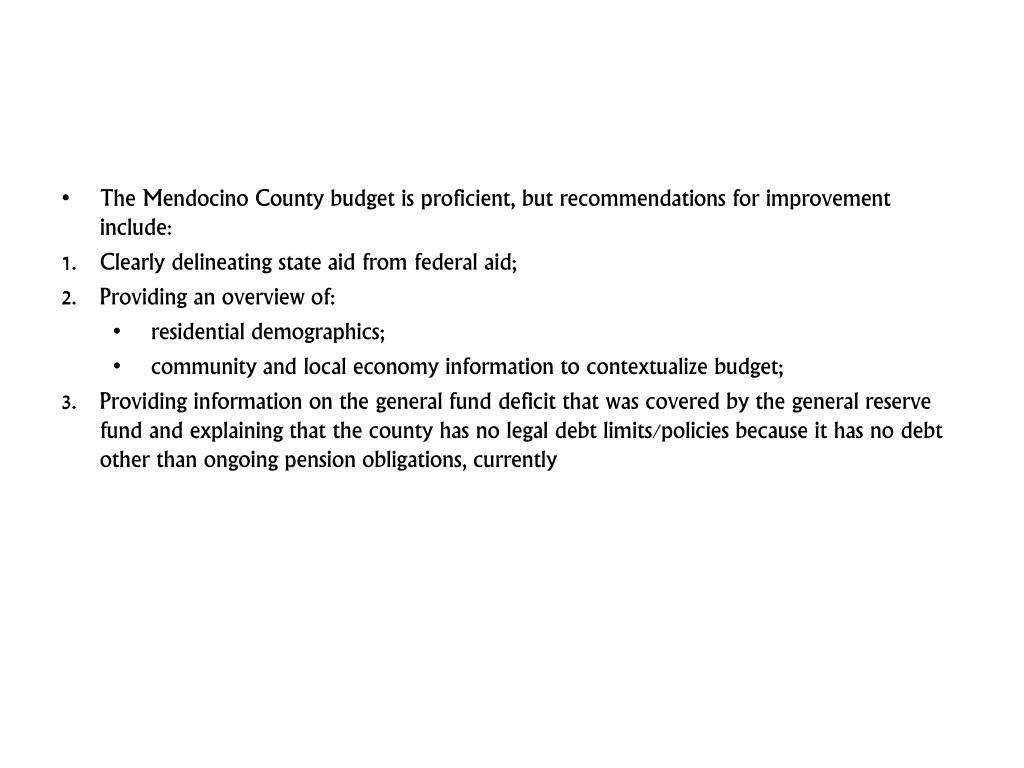 The Mendocino County budget is proficient, but recommendations for improvement include: • Clearly delineating state aid from federal aid; • Providing an overview of: • residential demographics; • community and local economy information to contextualize budget; • Providing information on the general fund deficit that was covered by the general reserve fund and explaining that the county has no legal debt limits/policies because it has no debt other than ongoing pension obligations, currently