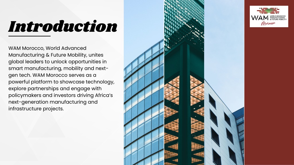 2. Introduction WAM Morocco, World Advanced Manufacturing & Future Mobility, unites global leaders to unlock opportunities in smart manufacturing, mobility and next- gen tech. WAM Morocco serves as a powerful platform to showcase technology, explore partnerships and engage with policymakers and investors driving Africa’s next-generation manufacturing and infrastructure projects.