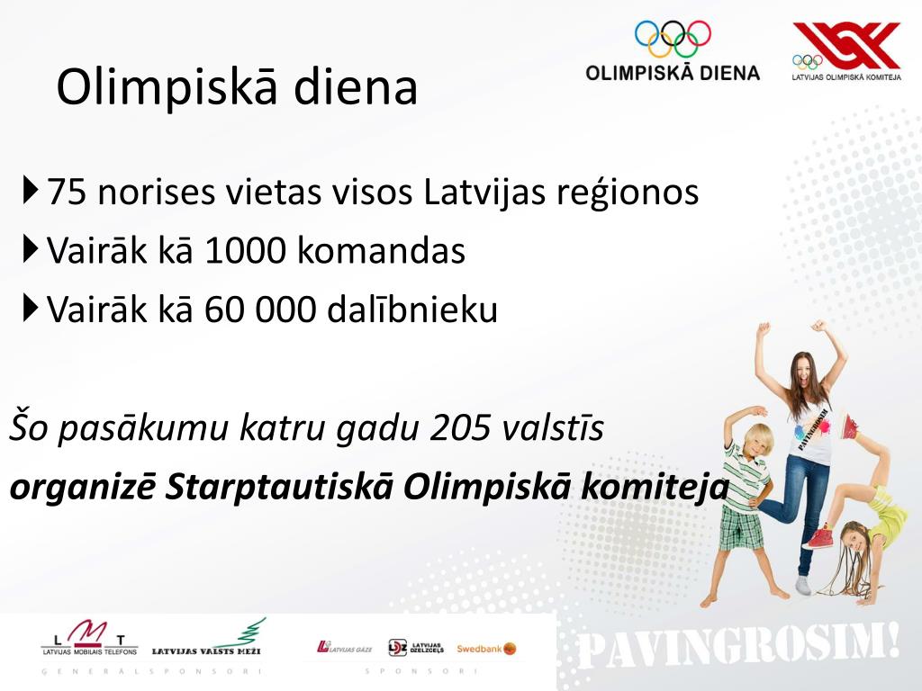 Olimpiskā diena • 75 norises vietas visos Latvijas reģionos • Vairāk kā 1000 komandas • Vairāk kā 60 000 dalībnieku Šo pasākumu katru gadu 205 valstīs organizē Starptautiskā Olimpiskā komiteja