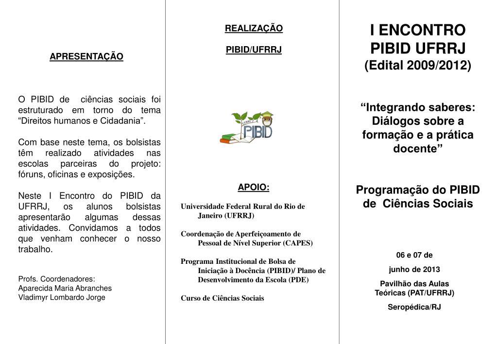 I ENCONTRO PIBID UFRRJ (Edital 2009/2012) “Integrando saberes: Diálogos sobre a formação e a prática docente” Programação do PIBID de Ciências Sociais REALIZAÇÃO PIBID/UFRRJ APOIO: Universidade Federal Rural do Rio de Janeiro (UFRRJ) Coordenação de Aperfeiçoamento de Pessoal de Nível Superior (CAPES) Programa Institucional de Bolsa de Iniciação à Docência (PIBID)/ Plano de Desenvolvimento da Escola (PDE) Curso de Ciências Sociais 06 e 07 de junho de 2013 Pavilhão das Aulas Teóricas (PAT/UFRRJ) Seropédica/RJ