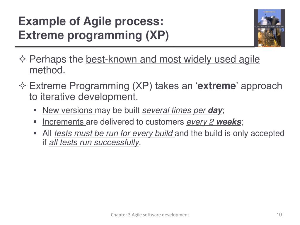 Perhaps the best-known and most widely used agile method. Extreme Programming (XP) takes an ‘extreme’ approach to iterative development. New versions may be built several times per day; Increments are delivered to customers every 2 weeks; All tests must be run for every build and the build is only accepted if all tests run successfully. Example of Agile process:Extreme programming (XP) Chapter 3 Agile software development
