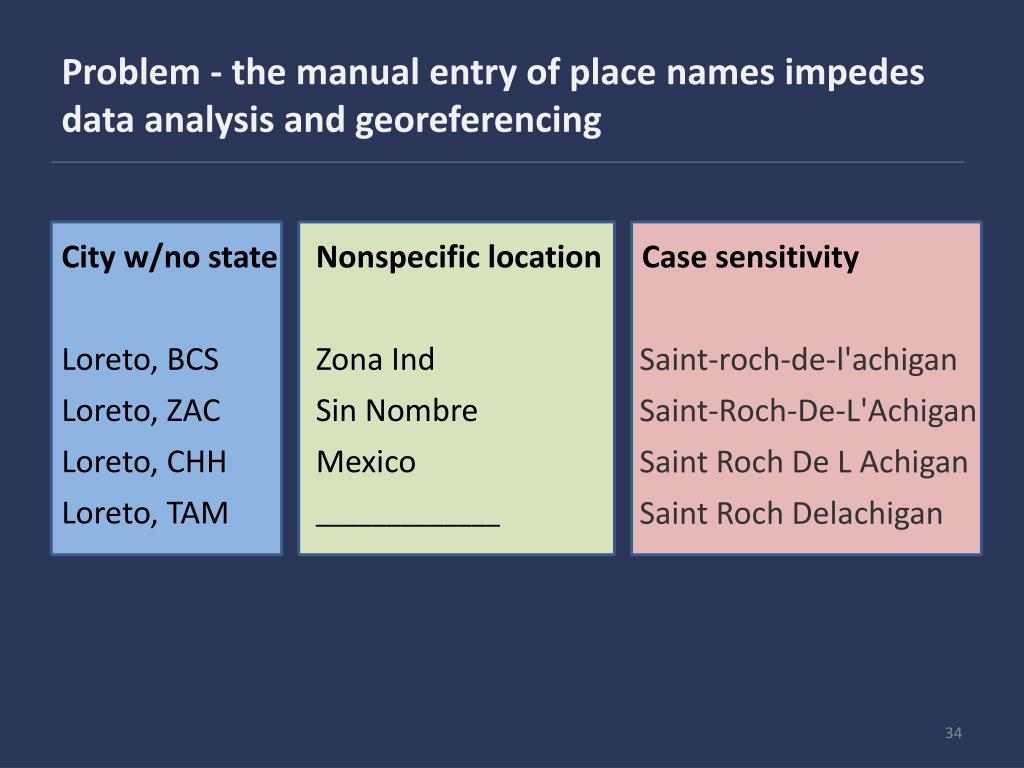 Problem - the manual entry of place names impedes data analysis and georeferencing
