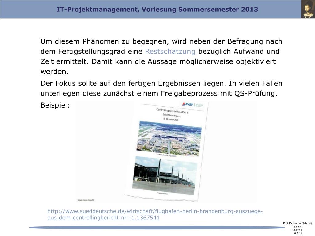 Um diesem Phänomen zu begegnen, wird neben der Befragung nach dem Fertigstellungsgrad eine Restschätzung bezüglich Aufwand und Zeit ermittelt. Damit kann die Aussage möglicherweise objektiviert werden. Der Fokus sollte auf den fertigen Ergebnissen liegen. In vielen Fällen unterliegen diese zunächst einem Freigabeprozess mit QS-Prüfung. Beispiel: http://www.sueddeutsche.de/wirtschaft/flughafen-berlin-brandenburg-auszuege-aus-dem-controllingbericht-nr--1.1367541