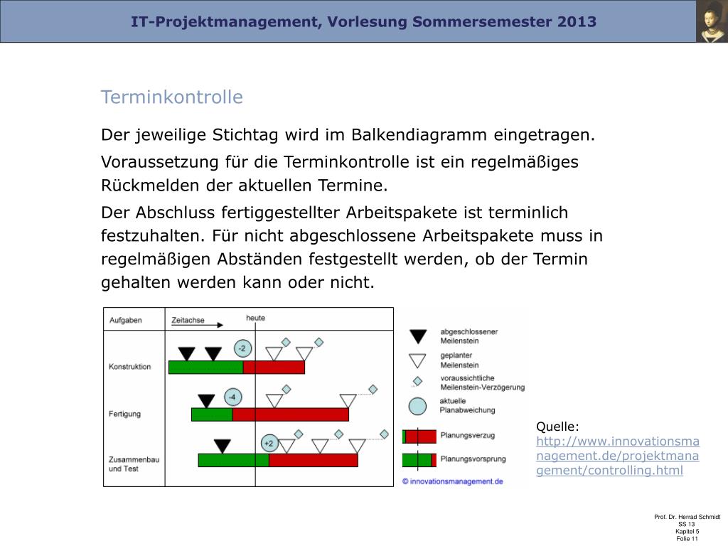 Terminkontrolle Der jeweilige Stichtag wird im Balkendiagramm eingetragen. Voraussetzung für die Terminkontrolle ist ein regelmäßiges Rückmelden der aktuellen Termine. Der Abschluss fertiggestellter Arbeitspakete ist terminlich festzuhalten. Für nicht abgeschlossene Arbeitspakete muss in regelmäßigen Abständen festgestellt werden, ob der Termin gehalten werden kann oder nicht. Quelle: http://www.innovationsmanagement.de/projektmanagement/controlling.html