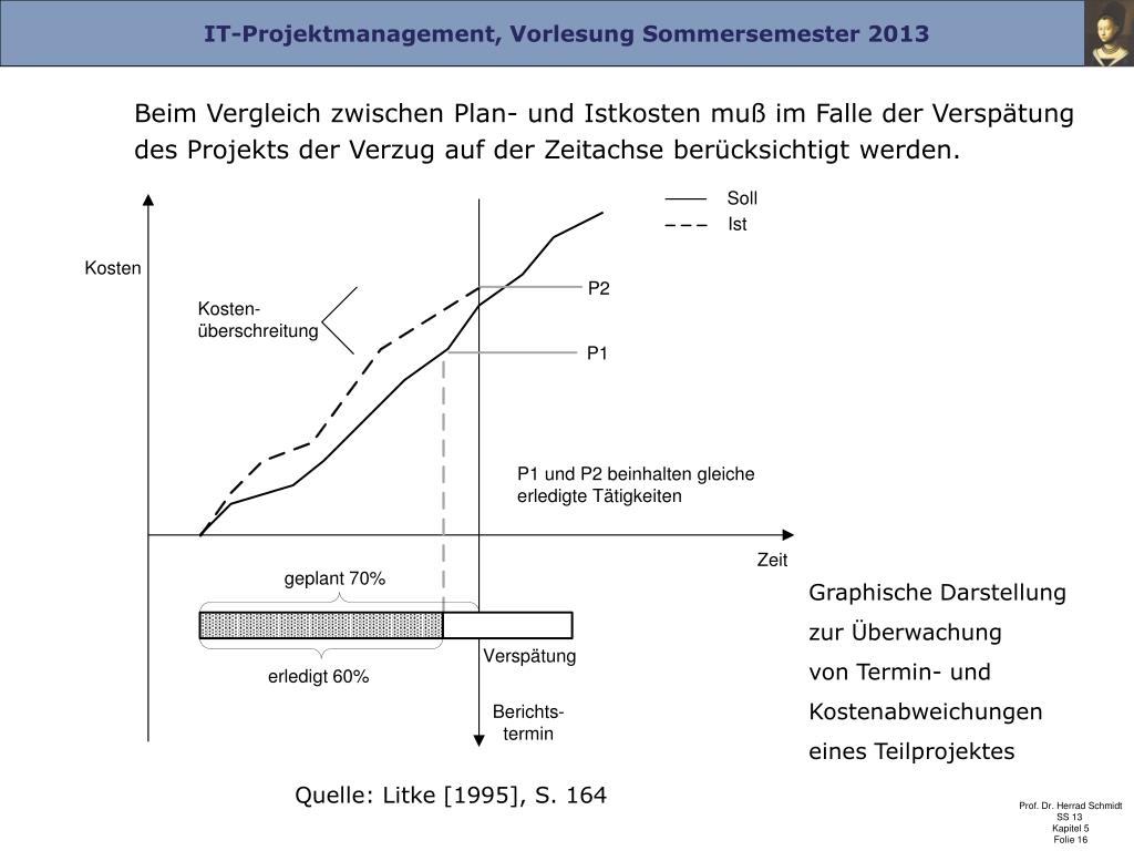 Beim Vergleich zwischen Plan- und Istkosten muß im Falle der Verspätung des Projekts der Verzug auf der Zeitachse berücksichtigt werden. Graphische Darstellung zur Überwachung von Termin- und Kostenabweichungen eines Teilprojektes Quelle: Litke [1995], S. 164