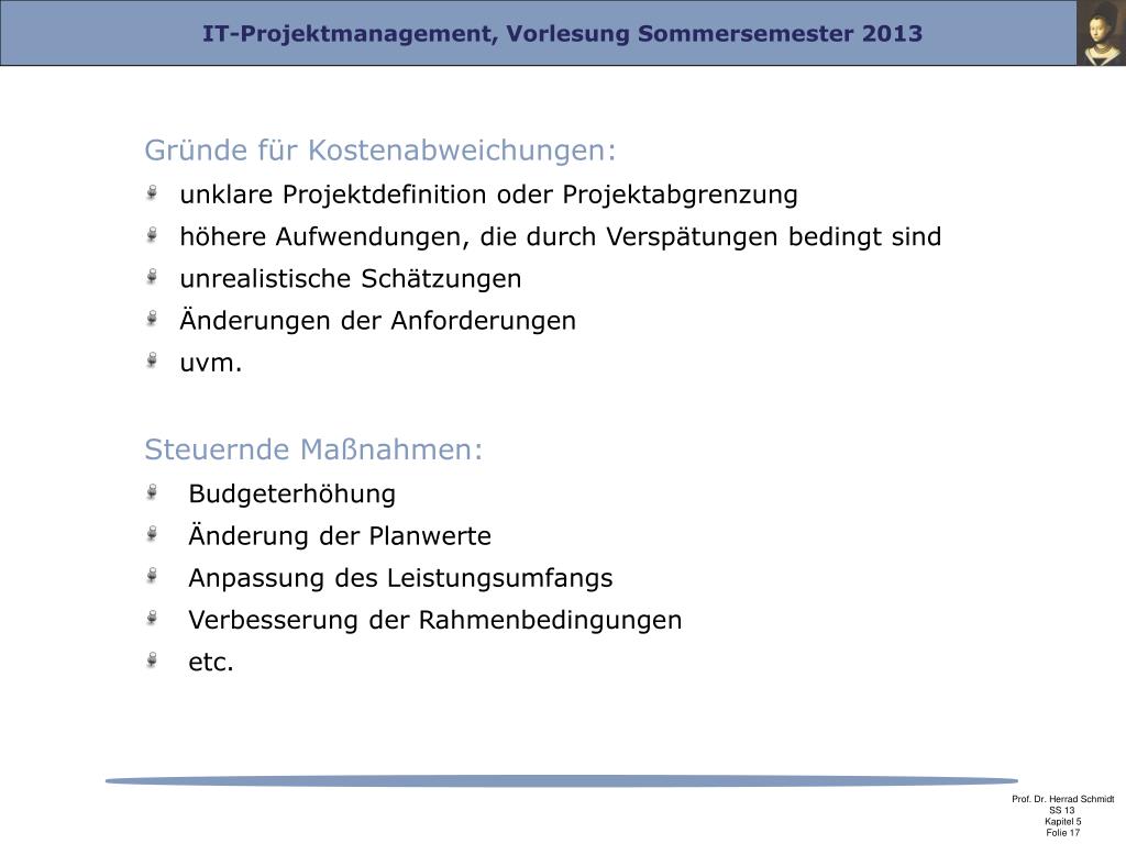 Gründe für Kostenabweichungen: unklare Projektdefinition oder Projektabgrenzung höhere Aufwendungen, die durch Verspätungen bedingt sind unrealistische Schätzungen Änderungen der Anforderungen uvm. Steuernde Maßnahmen: Budgeterhöhung Änderung der Planwerte Anpassung des Leistungsumfangs Verbesserung der Rahmenbedingungen etc.