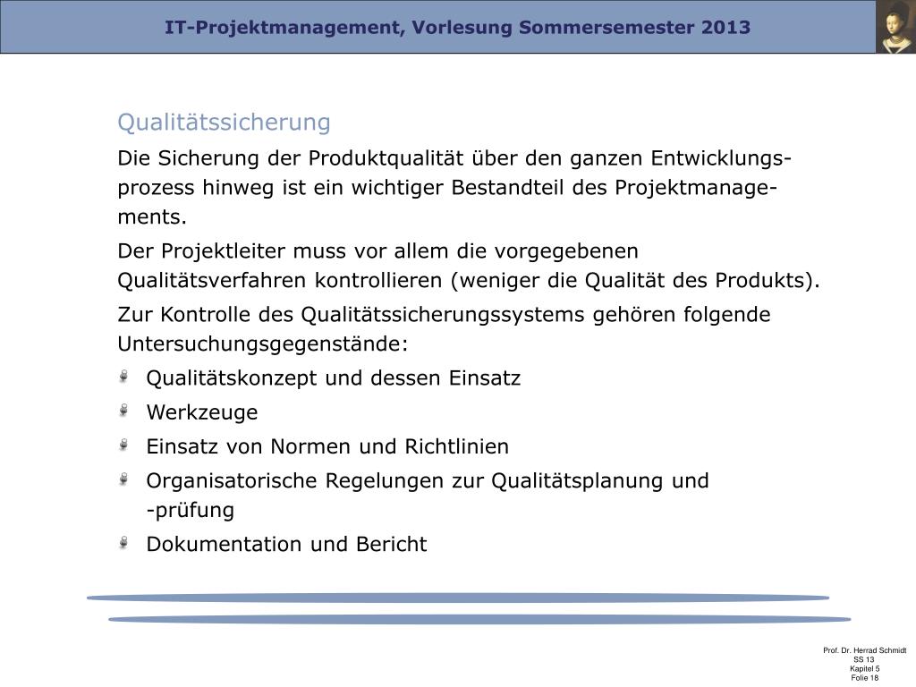 Qualitätssicherung Die Sicherung der Produktqualität über den ganzen Entwicklungs-prozesshinweg ist ein wichtiger Bestandteil des Projektmanage-ments. Der Projektleiter muss vor allem die vorgegebenen Qualitätsverfahren kontrollieren (weniger die Qualität des Produkts). Zur Kontrolle des Qualitätssicherungssystems gehören folgende Untersuchungsgegenstände: Qualitätskonzept und dessen Einsatz Werkzeuge Einsatz von Normen und Richtlinien Organisatorische Regelungen zur Qualitätsplanung und-prüfung Dokumentation und Bericht