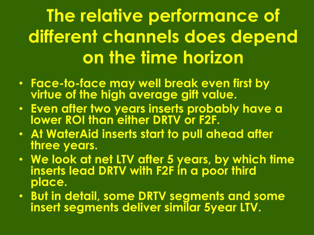 The relative performance of different channels does depend on the time horizon • Face-to-face may well break even first by virtue of the high average gift value. • Even after two years inserts probably have a lower ROI than either DRTV or F2F. • At WaterAid inserts start to pull ahead after three years. • We look at net LTV after 5 years, by which time inserts lead DRTV with F2F in a poor third place. • But in detail, some DRTV segments and some insert segments deliver similar 5year LTV.