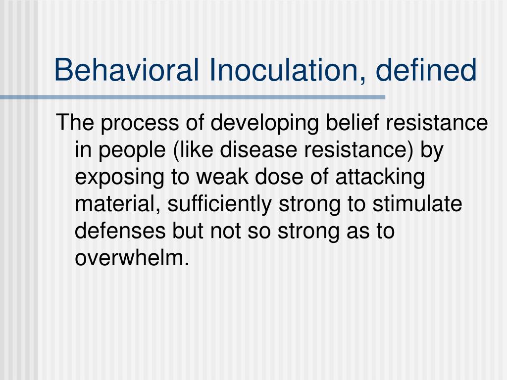 Behavioral Inoculation, defined The process of developing belief resistance in people (like disease resistance) by exposing to weak dose of attacking material, sufficiently strong to stimulate defenses but not so strong as to overwhelm.