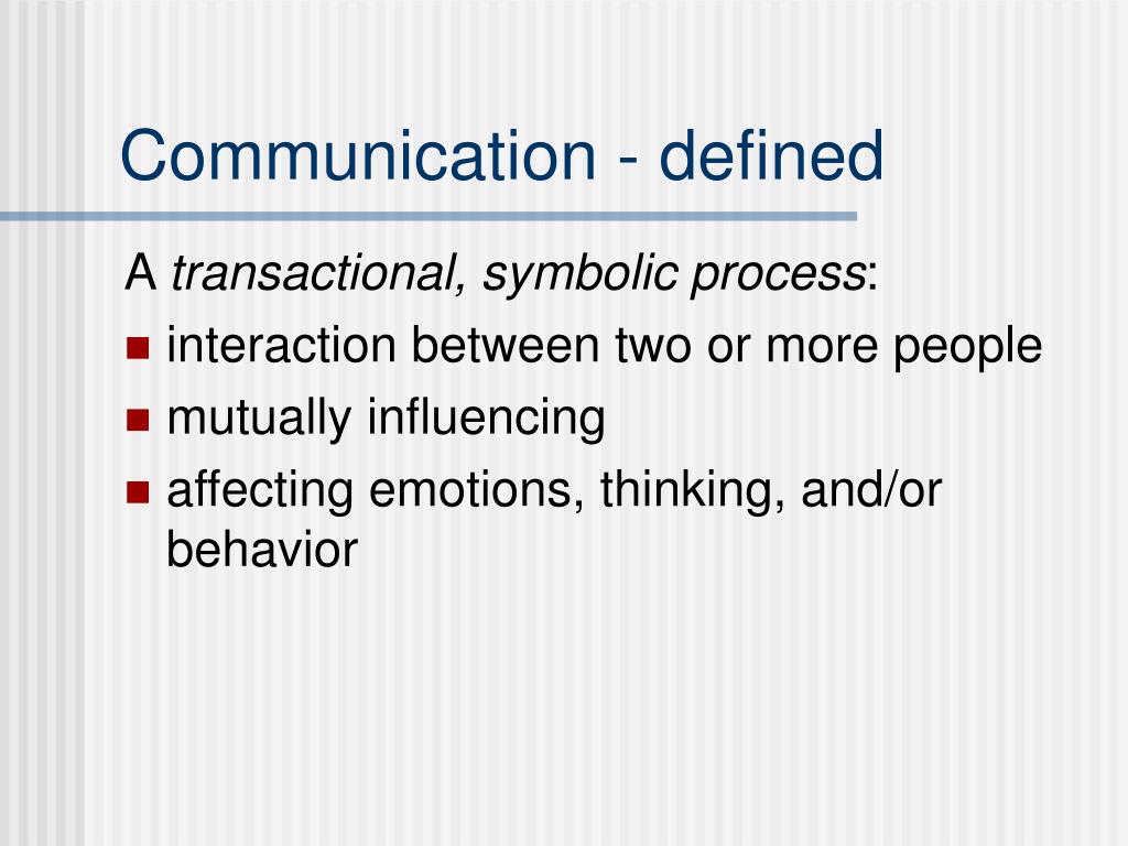 Communication - defined A transactional, symbolic process: • interaction between two or more people • mutually influencing • affecting emotions, thinking, and/or behavior
