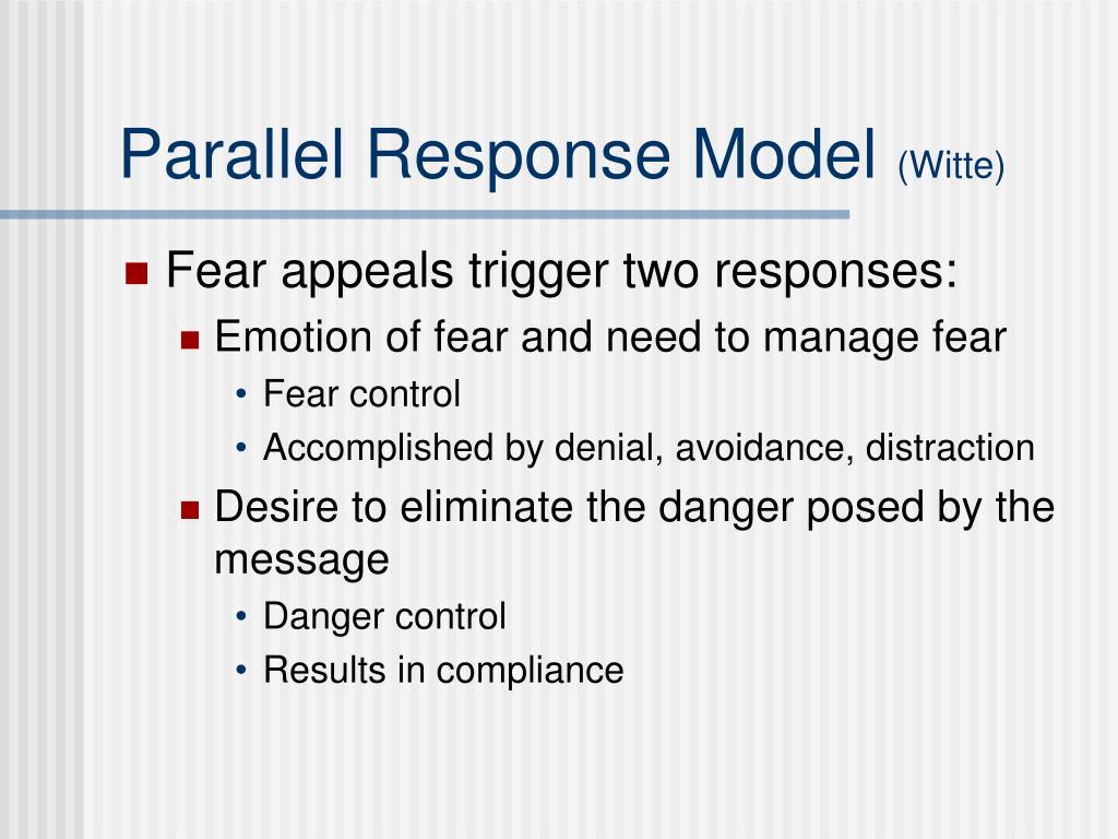 Parallel Response Model (Witte) • Fear appeals trigger two responses: • Emotion of fear and need to manage fear • Fear control • Accomplished by denial, avoidance, distraction • Desire to eliminate the danger posed by the message • Danger control • Results in compliance