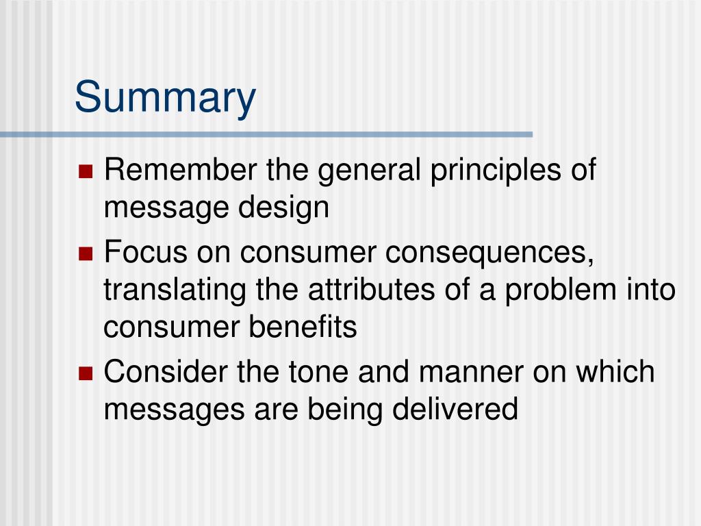 Summary • Remember the general principles of message design • Focus on consumer consequences, translating the attributes of a problem into consumer benefits • Consider the tone and manner on which messages are being delivered