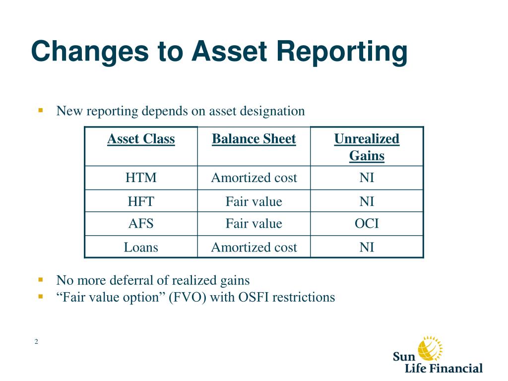 Changes to Asset Reporting • New reporting depends on asset designation • No more deferral of realized gains • “Fair value option” (FVO) with OSFI restrictions