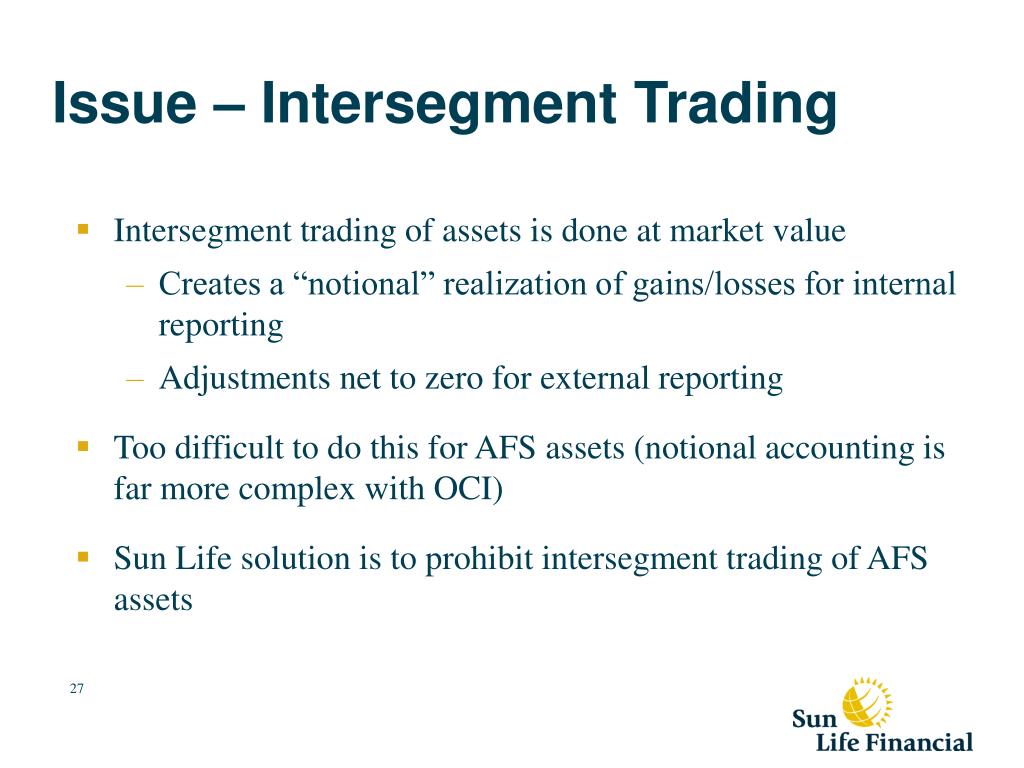 Issue – Intersegment Trading • Intersegment trading of assets is done at market value • Creates a “notional” realization of gains/losses for internal reporting • Adjustments net to zero for external reporting • Too difficult to do this for AFS assets (notional accounting is far more complex with OCI) • Sun Life solution is to prohibit intersegment trading of AFS assets