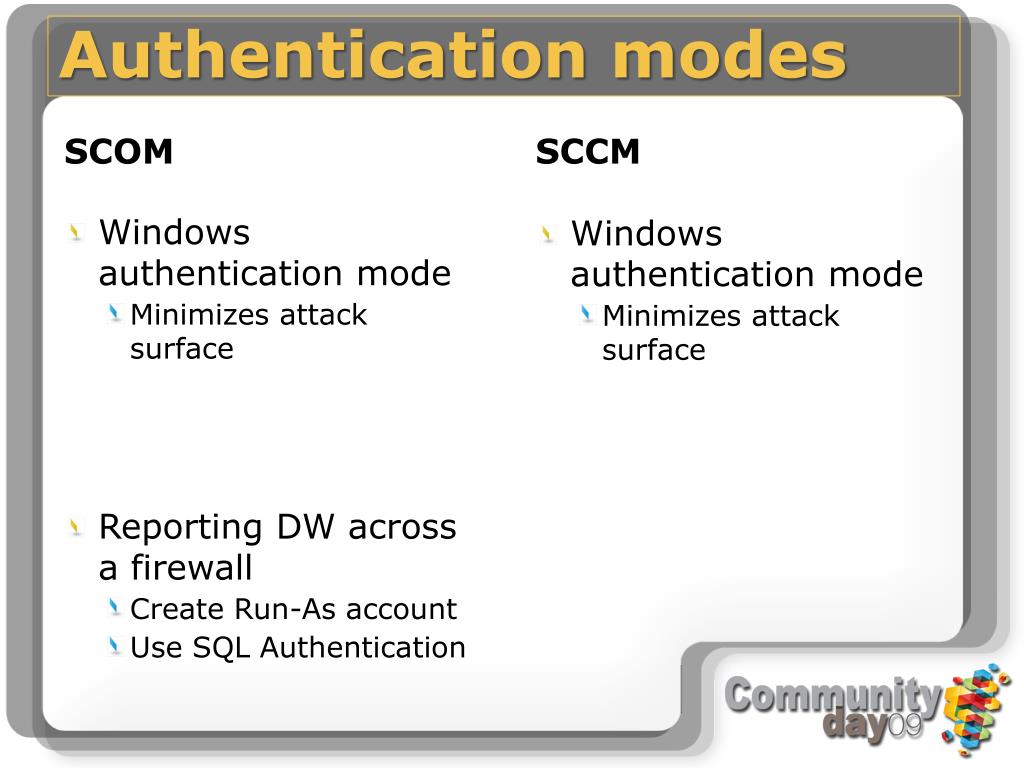 Authentication modes SCOM SCCM • Windows authentication mode • Minimizes attack surface • Reporting DW across a firewall • Create Run-As account • Use SQL Authentication • Windows authentication mode • Minimizes attack surface