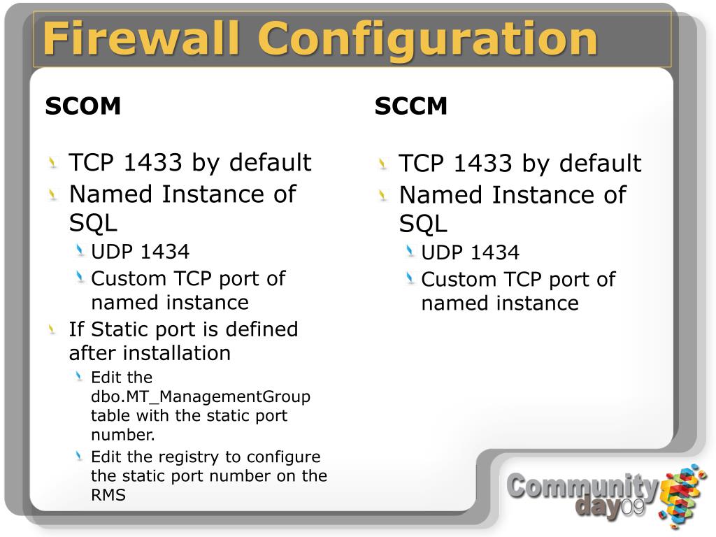 Firewall Configuration SCOM SCCM • TCP 1433 by default • Named Instance of SQL • UDP 1434 • Custom TCP port of named instance • If Static port is defined after installation • Edit the dbo.MT_ManagementGroup table with the static port number. • Edit the registry to configure the static port number on the RMS • TCP 1433 by default • Named Instance of SQL • UDP 1434 • Custom TCP port of named instance