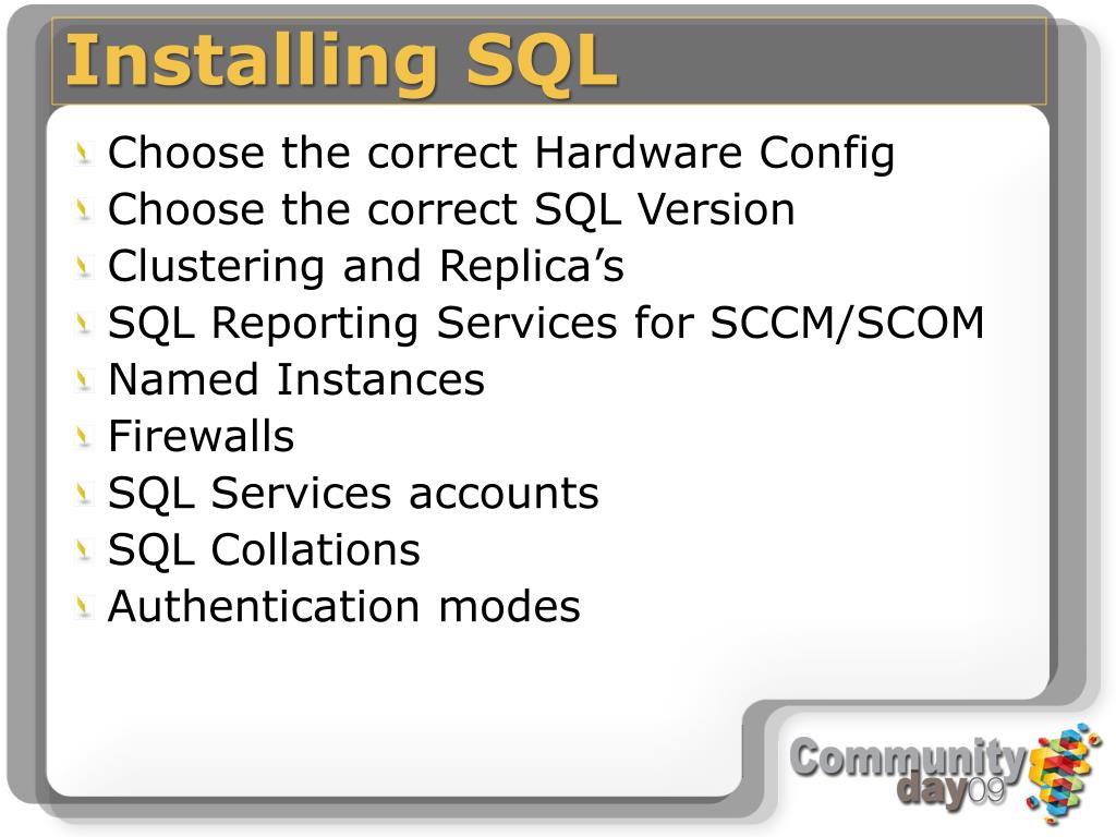 Installing SQL • Choose the correct Hardware Config • Choose the correct SQL Version • Clustering and Replica’s • SQL Reporting Services for SCCM/SCOM • Named Instances • Firewalls • SQL Services accounts • SQL Collations • Authentication modes