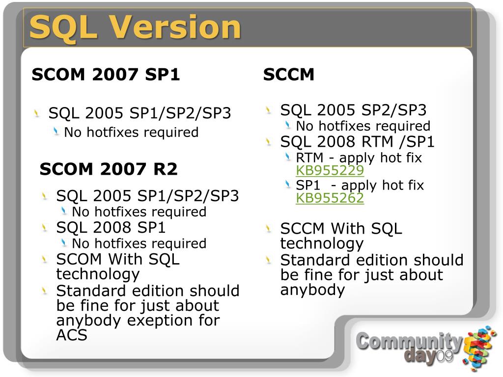 SQL Version SCOM 2007 SP1 SCCM • SQL 2005 SP1/SP2/SP3 • No hotfixes required • SQL 2005 SP2/SP3 • No hotfixes required • SQL 2008 RTM /SP1 • RTM - apply hot fix KB955229 • SP1 - apply hot fix KB955262 • SCCM With SQL technology • Standard edition should be fine for just about anybody SCOM 2007 R2 • SQL 2005 SP1/SP2/SP3 • No hotfixes required • SQL 2008 SP1 • No hotfixes required • SCOM With SQL technology • Standard edition should be fine for just about anybody exeption for ACS
