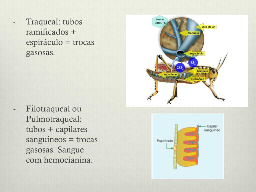 Traqueal: tubos ramificados + espiráculo = trocas gasosas. - Filotraqueal ou Pulmotraqueal: tubos + capilares sanguíneos = trocas gasosas. Sangue com hemocianina.