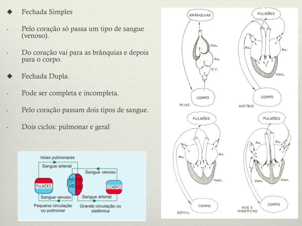 Fechada Simples • Pelo coração só passa um tipo de sangue (venoso). • Do coração vai para as brânquias e depois para o corpo. • Fechada Dupla. • Pode ser completa e incompleta. • Pelo coração passam dois tipos de sangue. • Dois ciclos: pulmonar e geral