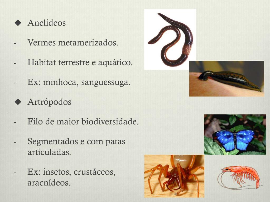 Anelídeos • Vermes metamerizados. • Habitat terrestre e aquático. • Ex: minhoca, sanguessuga. • Artrópodos • Filo de maior biodiversidade. • Segmentados e com patas articuladas. • Ex: insetos, crustáceos, aracnídeos.