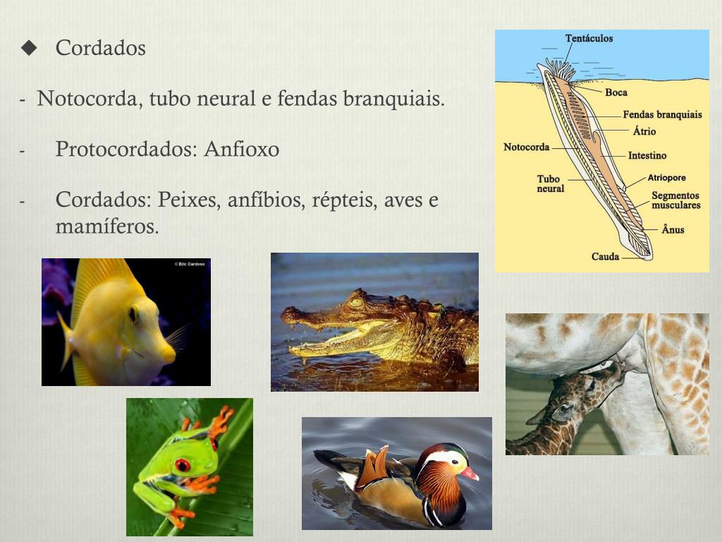 Cordados - Notocorda, tubo neural e fendas branquiais. • Protocordados: Anfioxo • Cordados: Peixes, anfíbios, répteis, aves e mamíferos.