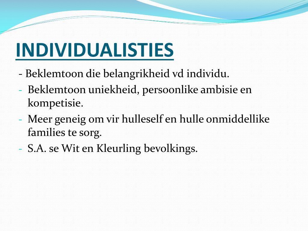 INDIVIDUALISTIES - Beklemtoon die belangrikheid vd individu. • Beklemtoon uniekheid, persoonlike ambisie en kompetisie. • Meer geneig om vir hulleself en hulle onmiddellike families te sorg. • S.A. se Wit en Kleurling bevolkings.