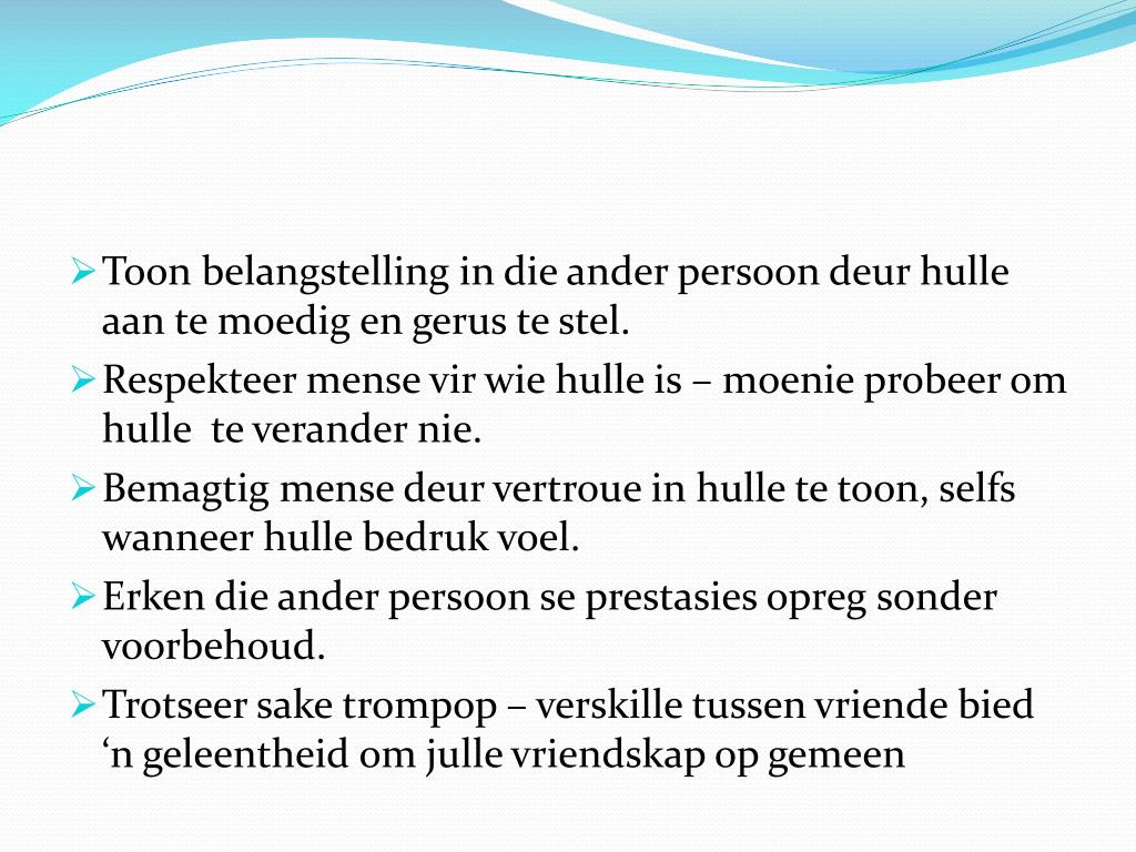 Toon belangstelling in die ander persoon deur hulle aan te moedig en gerus te stel. • Respekteer mense vir wie hulle is – moenie probeer om hulle te verander nie. • Bemagtig mense deur vertroue in hulle te toon, selfs wanneer hulle bedruk voel. • Erken die ander persoon se prestasies opreg sonder voorbehoud. • Trotseer sake trompop – verskille tussen vriende bied ‘n geleentheid om julle vriendskap op gemeen
