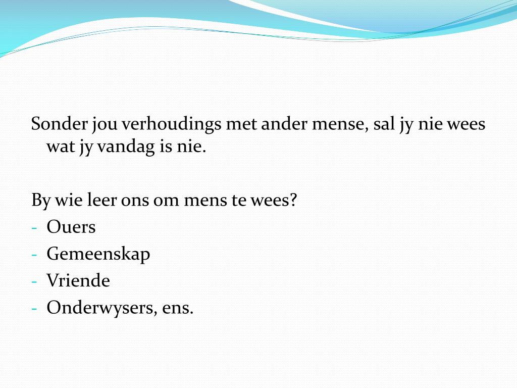 Sonder jou verhoudings met ander mense, sal jy nie wees wat jy vandag is nie. By wie leer ons om mens te wees? • Ouers • Gemeenskap • Vriende • Onderwysers, ens.