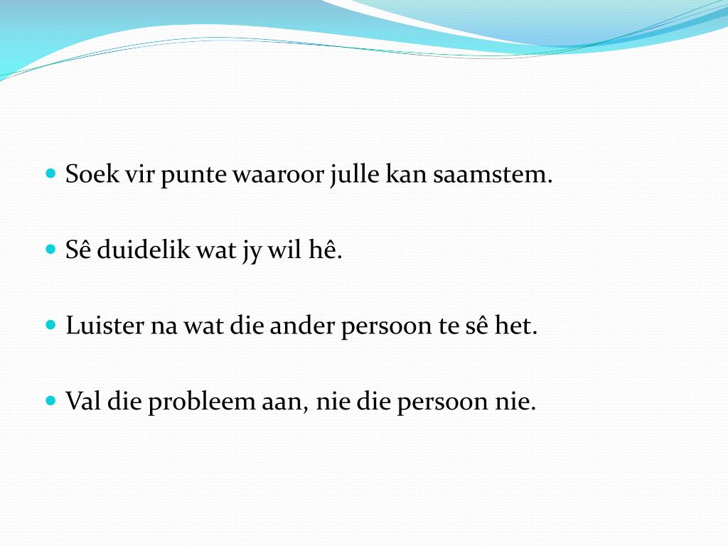 Soek vir punte waaroor julle kan saamstem. • Sê duidelik wat jy wil hê. • Luister na wat die ander persoon te sê het. • Val die probleem aan, nie die persoon nie.