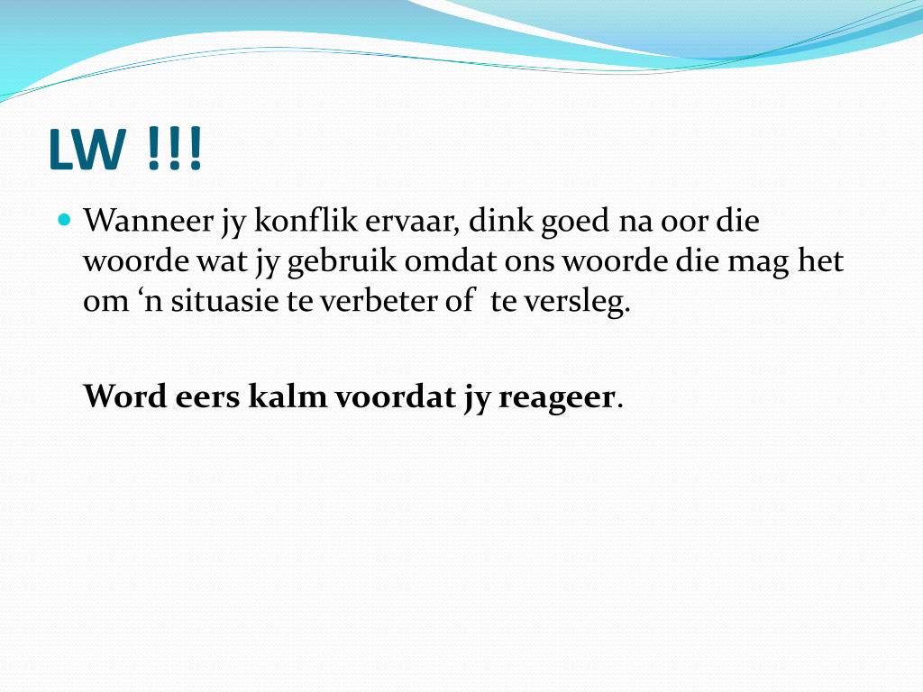 LW !!! • Wanneer jy konflik ervaar, dink goed na oor die woorde wat jy gebruik omdat ons woorde die mag het om ‘n situasie te verbeter of te versleg. Word eers kalm voordat jy reageer.