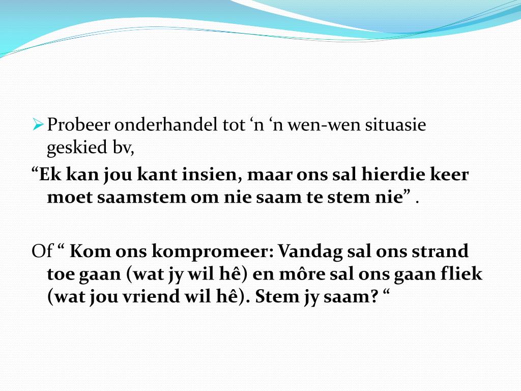 Probeer onderhandel tot ‘n ‘n wen-wen situasie geskied bv, “Ek kan jou kant insien, maar ons sal hierdie keer moet saamstem om nie saam te stem nie” . Of “ Kom ons kompromeer: Vandag sal ons strand toe gaan (wat jy wil hê) en môre sal ons gaan fliek (wat jou vriend wil hê). Stem jy saam? “