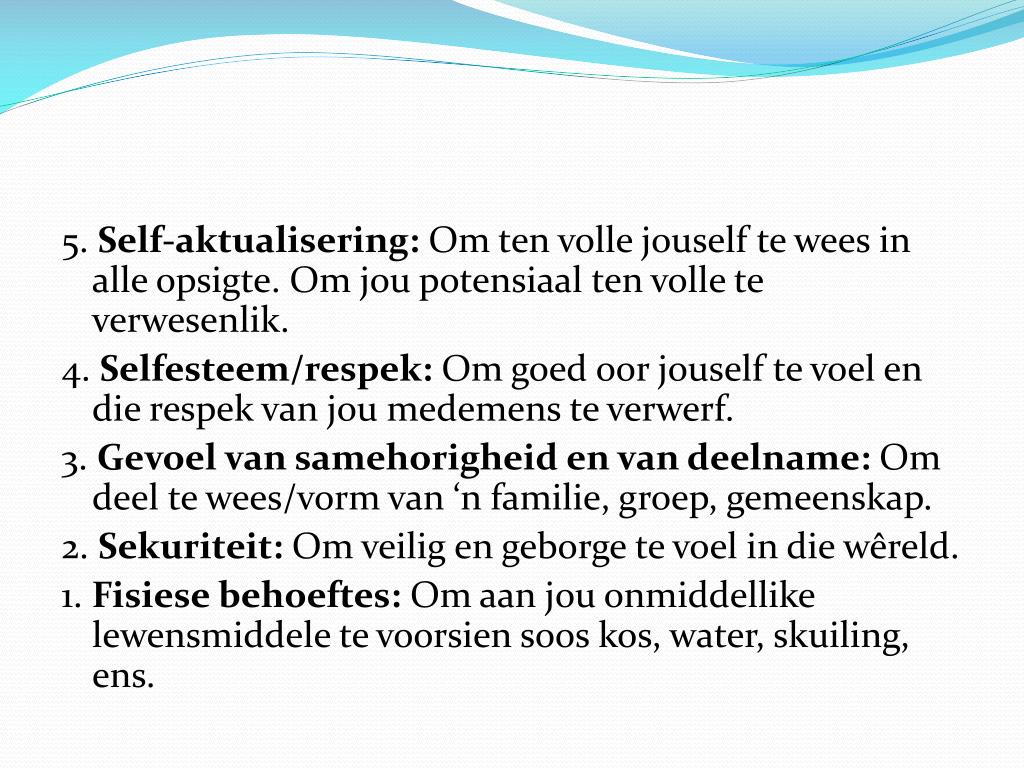 5. Self-aktualisering: Om ten vollejouselftewees in alleopsigte. Om joupotensiaal ten volleteverwesenlik. 4. Selfesteem/respek: Om goedoorjouselftevoel en die respek van joumedemensteverwerf. 3. Gevoel van samehorigheid en van deelname: Om deeltewees/vorm van ‘n familie, groep, gemeenskap. 2. Sekuriteit: Om veilig en geborgetevoel in die wêreld. 1. Fisiesebehoeftes: Om aanjouonmiddellikelewensmiddeletevoorsiensooskos, water, skuiling, ens.