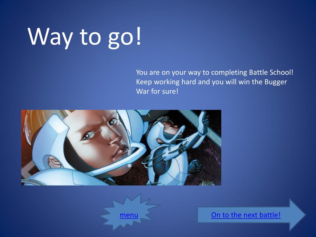 Way to go! You are on your way to completing Battle School! Keep working hard and you will win the Bugger War for sure! On to the next battle! menu