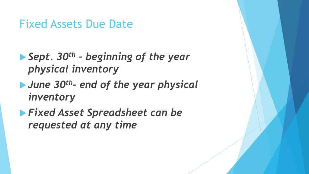 Fixed Assets. Fixed Asset Procedure Physical Inventory Template Fixed Assets Spreadsheet (Sample) Due Dates Contact Information. Fixed Assets Procedure. Effective July 1 Can be found on SharePoint under Finance in Fixed Assets section Summarizes the following: Definition of Fixed Asset