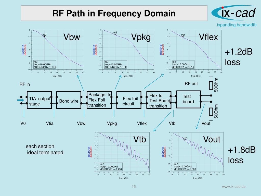RF Path in Frequency Domain Vbw Vpkg Vflex +1.2dB loss RF out RF in 50Ohm Packageto FlexFoil transition Flexto Test Board transition Test board Flex foil circuit TIA output stage Bond wire 50Ohm V0 Vtia Vbw Vpkg Vflex Vtb Vout Vtb Vout each section ideal terminated +1.8dB loss