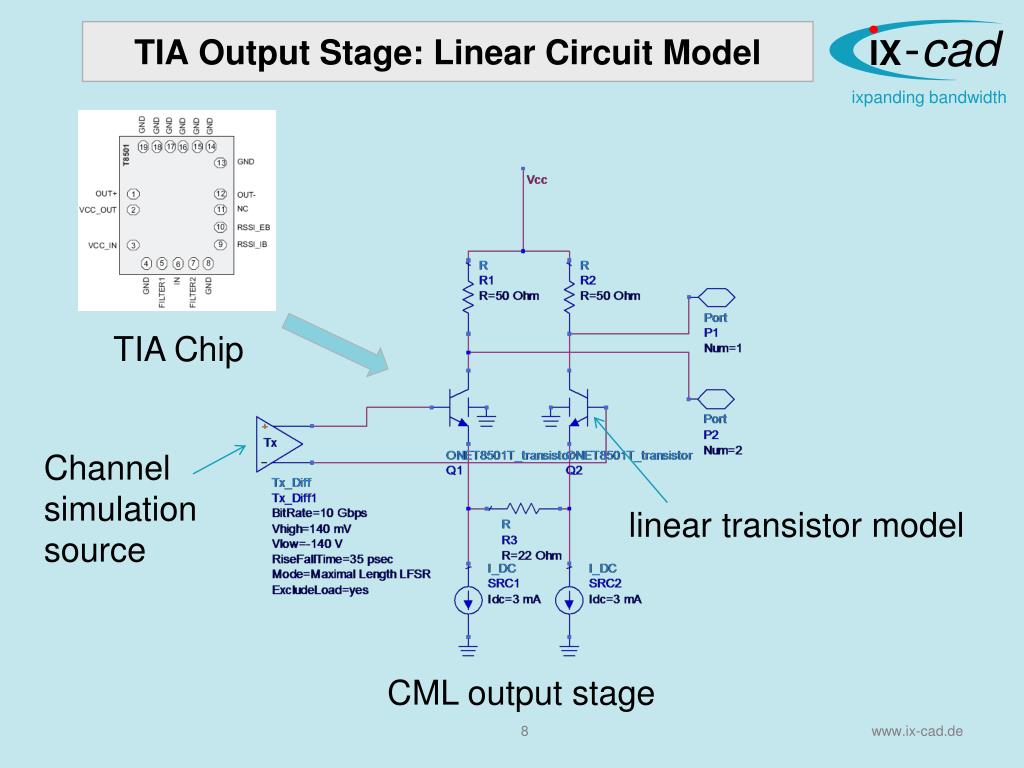 TIA Output Stage: Linear Circuit Model TIA Chip Channel simulation source linear transistor model CML output stage