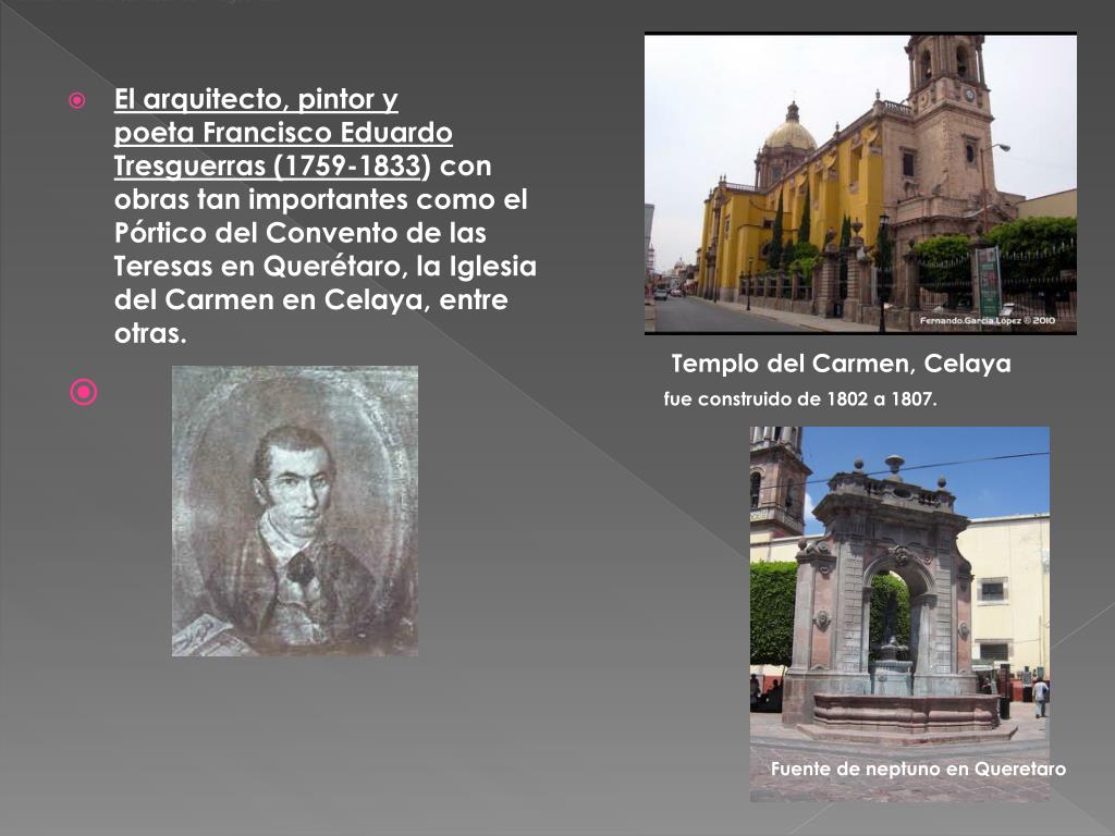 Retrato de Francisco Eduardo Tresguerras. • El arquitecto, pintor y poeta Francisco Eduardo Tresguerras (1759-1833) con obras tan importantes como el Pórtico del Convento de las Teresas en Querétaro, la Iglesia del Carmen en Celaya, entre otras. Templo del Carmen, Celaya fue construido de 1802 a 1807. Fuente de neptuno en Queretaro