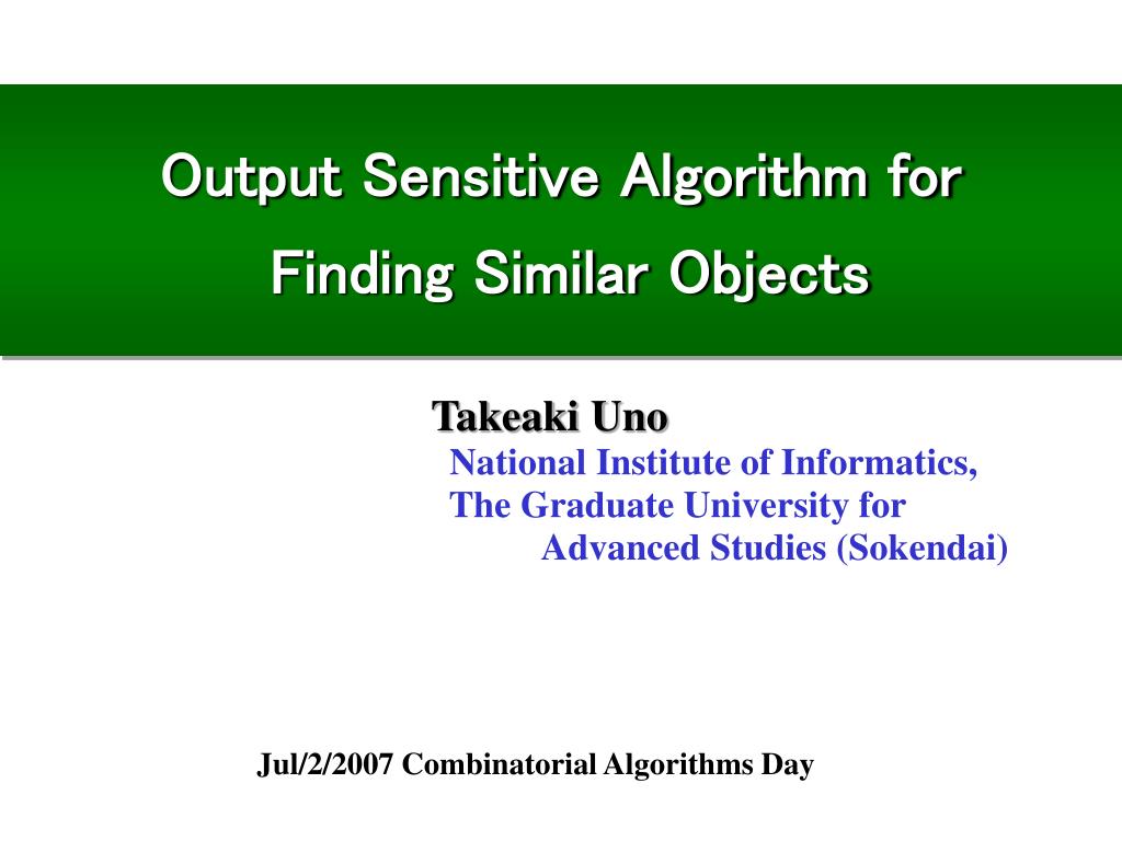 Output Sensitive Algorithm for Finding Similar Objects Takeaki Uno National Institute of Informatics, The Graduate University for Advanced Studies (Sokendai) Jul/2/2007 Combinatorial Algorithms Day