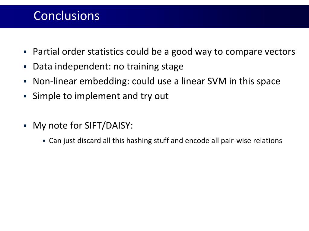 Conclusions • Partial order statistics could be a good way to compare vectors • Data independent: no training stage • Non-linear embedding: could use a linear SVM in this space • Simple to implement and try out • My note for SIFT/DAISY: • Can just discard all this hashing stuff and encode all pair-wise relations