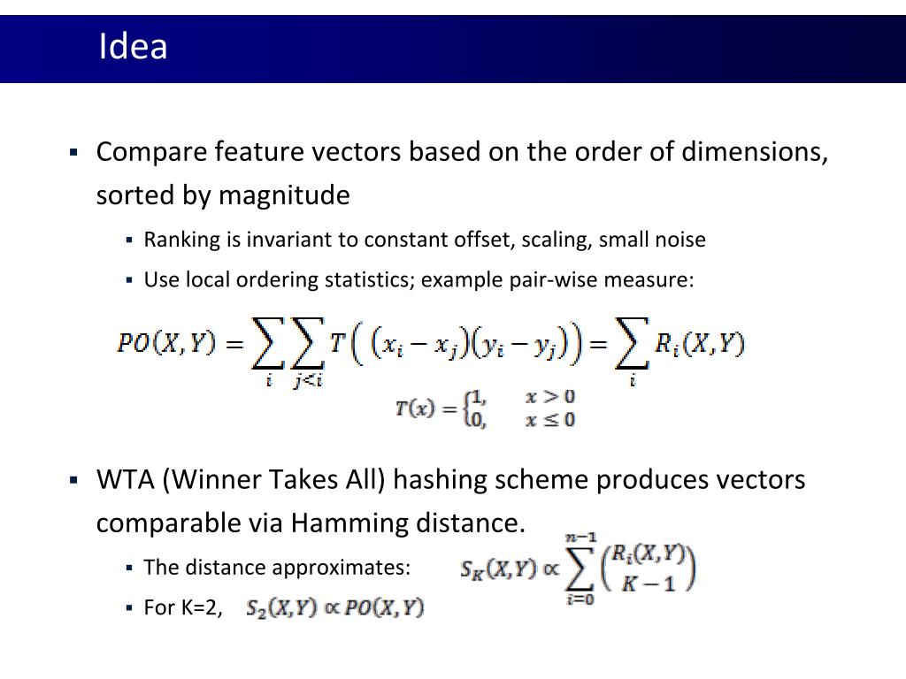 Idea • Compare feature vectors based on the order of dimensions, sorted by magnitude • Ranking is invariant to constant offset, scaling, small noise • Use local ordering statistics; example pair-wise measure: • WTA (Winner Takes All) hashing scheme produces vectors comparable via Hamming distance. • The distance approximates: • For K=2,