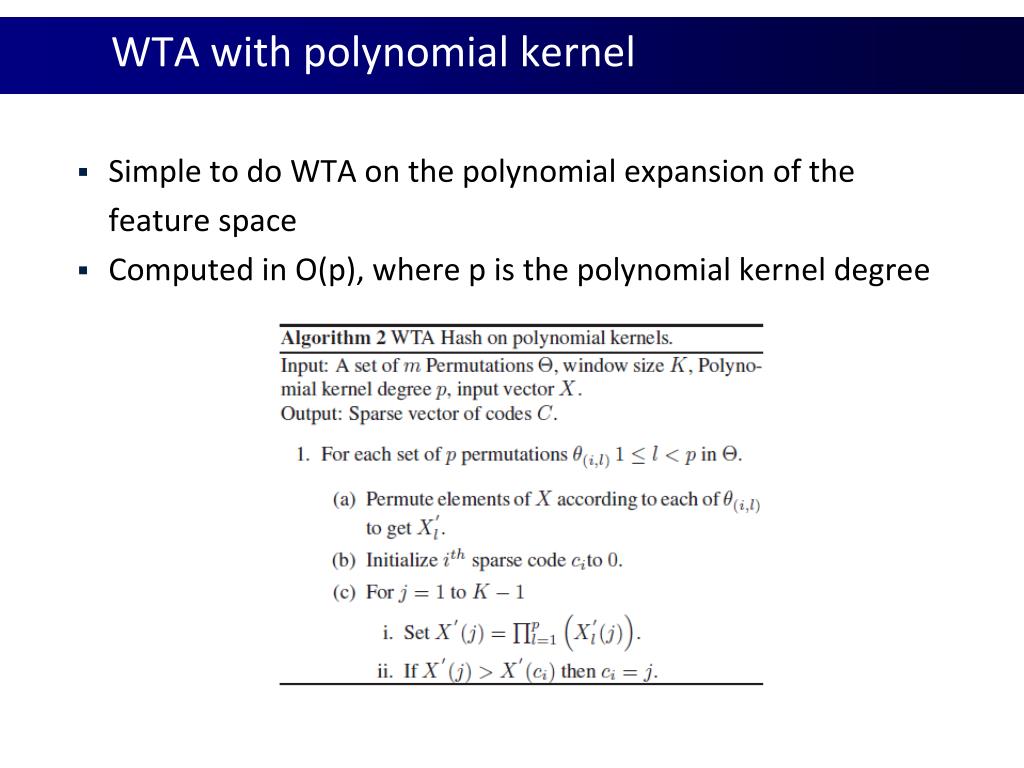 WTA with polynomial kernel • Simple to do WTA on the polynomial expansion of the feature space • Computed in O(p), where p is the polynomial kernel degree