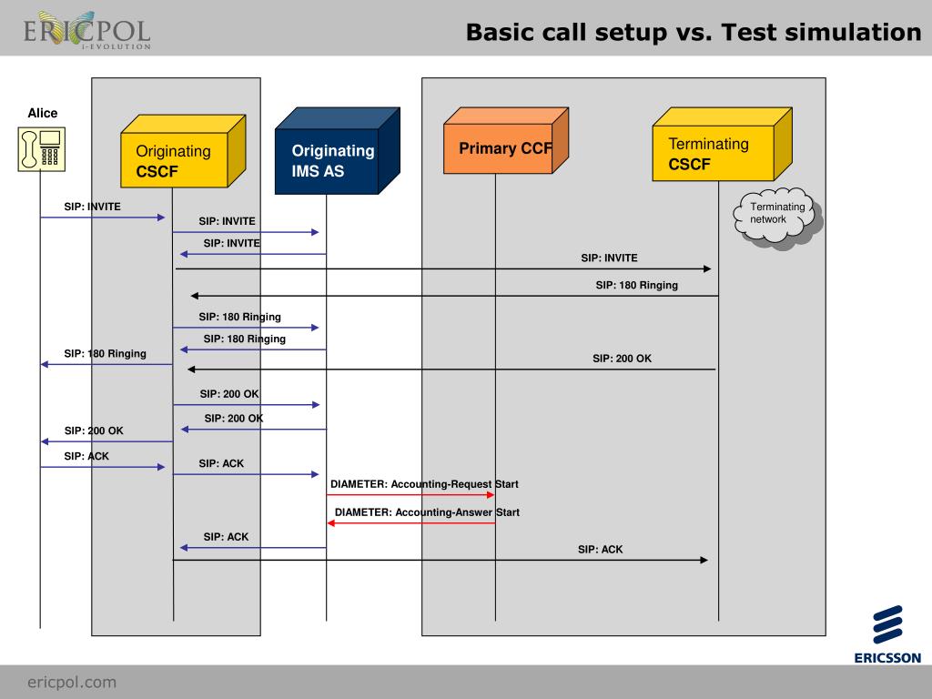 SIP:INVITE SIP:180 Ringing SIP:200 OK SIP:ACK SIP:ACK SIP:INVITE Originating IMS AS SIP:INVITE SIP:ACK Alice SIP:INVITE SIP:ACK SIP:180 Ringing SIP:200 OK Terminating CSCF Originating CSCF Terminating network SIP:200 OK SIP:180 Ringing SIP:200 OK SIP:180 Ringing DIAMETER: Accounting-Request Start DIAMETER: Accounting-Answer Start Basic call setup vs. Test simulation Primary CCF