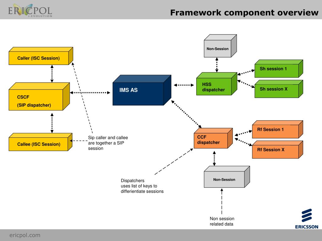 Caller (ISC Session) Callee (ISC Session) HSS dispatcher Sh session X Sh session 1 IMS AS Rf Session 1 Rf Session X CCF dispatcher Non session related data Framework component overview Non-Session CSCF (SIP dispatcher) Sip caller and callee are together a SIP session Non-Session Dispatchersuses list of keys todifferientiate sessions
